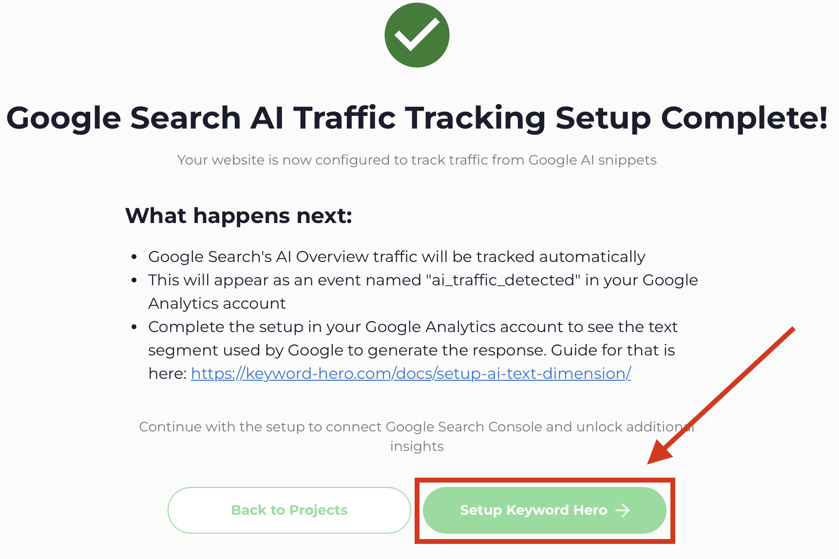If you have first configured AI Tracking, and you want to continue with the regular keyword tracking next, click the button “Setup Keyword Hero” on the bottom right: