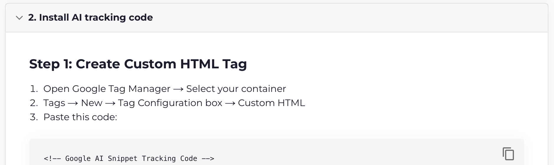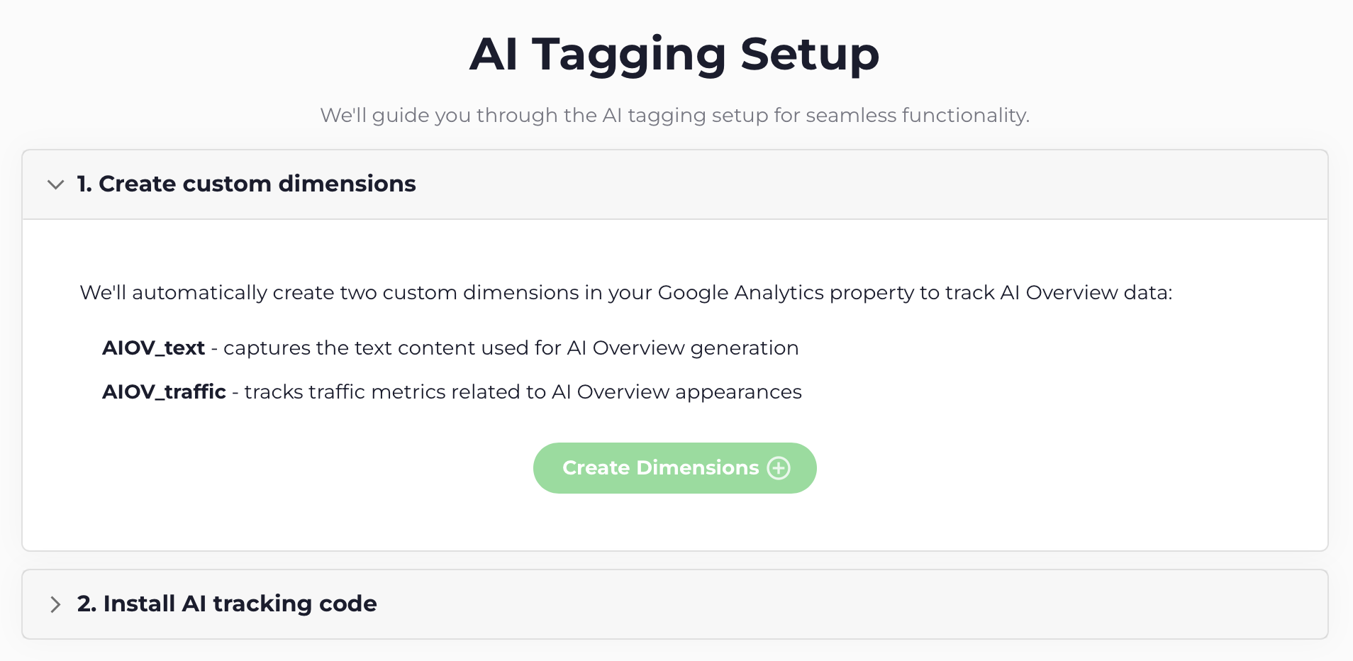 Our default keyword tracking is our familiar tracking system which allows you to connect keywords to session information. The AI tracking setup will enable you to track traffic directly from Google’s AI overview and it’s completely free to use. We will first go through the steps for the regular setup, if you wish to skip this, head over to step 8 for the AI Tracking Setup.