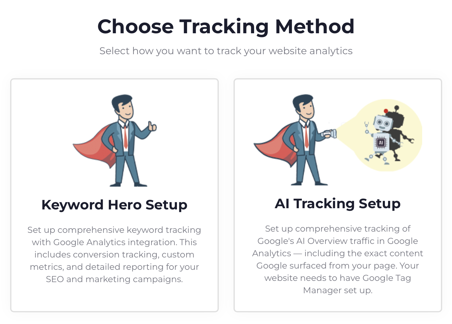 Our default keyword tracking is our familiar tracking system which allows you to connect keywords to session information. The AI tracking setup will enable you to track traffic directly from Google’s AI overview and it’s completely free to use. We will first go through the steps for the regular setup, if you wish to skip this, head over to step 8 for the AI Tracking Setup.